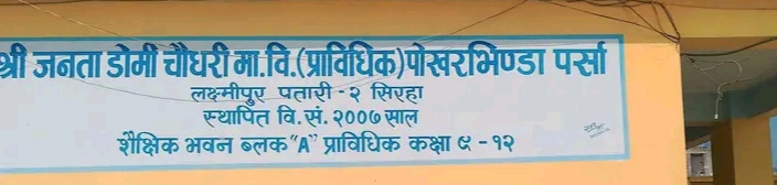 सिरहा १८ चैत्र -लक्ष्मीपुर पतारी गाउँपालिका वडा नं. २ पोखरभिन्डा पर्सा स्थित श्री जनता डोमि चौधरी माध्यमिक (प्राविधिक) विद्यालयमा यसै शैक्षिक सत्र २०८२ को वैशाख महिनादेखि ओसीडी (बाल विकास) देखि कक्षा ८ सम्म अंग्रेजी माध्यमका कक्षा सञ्चालनमा आएका छन्।